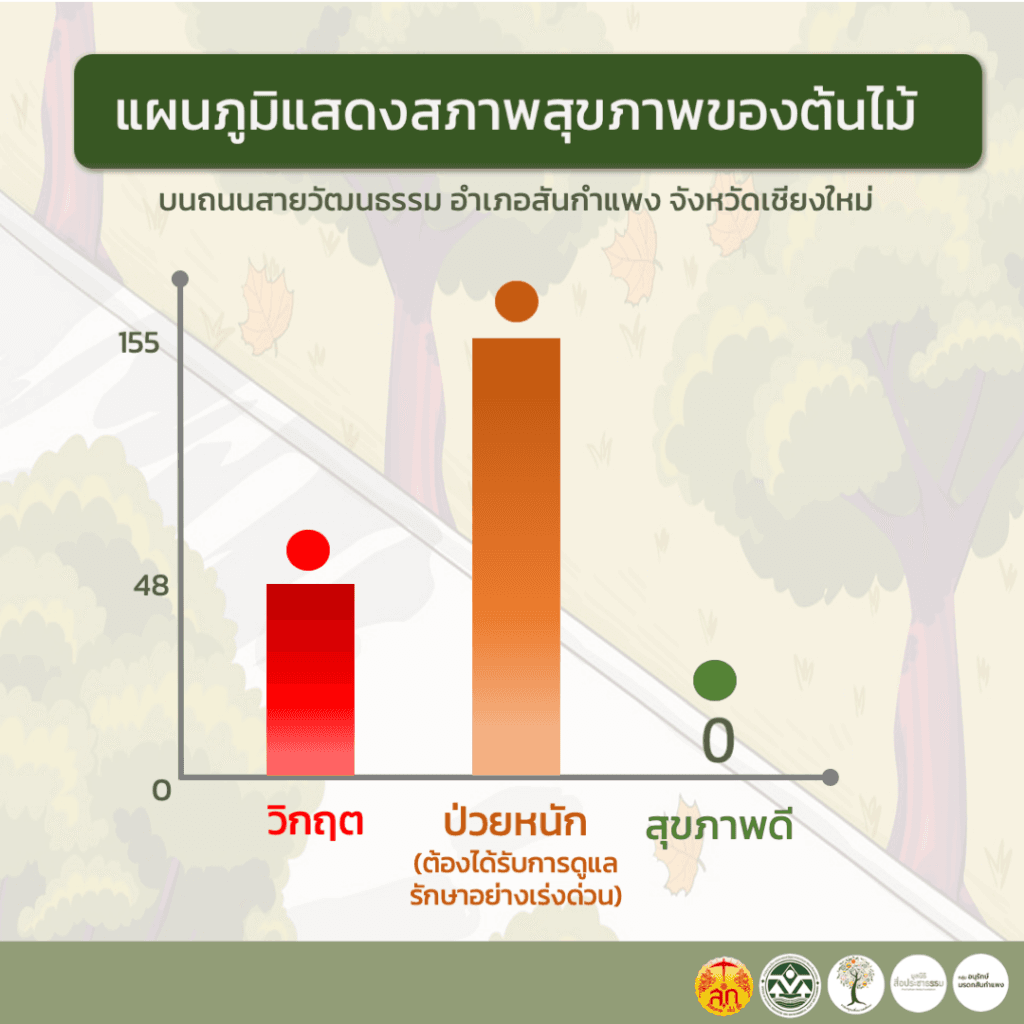 เมื่อจำแนกลักษณะปัญหาด้านสุขภาพพบว่ามีต้นที่มีเข้าข่ายสีส้ม ซึ่งหมายถึงมีอาการป่วยจำนวน 155 ต้น กล่าวคือมีลักษณะลำต้นมีบาดแผล มีโพรง ผุ มีเห็ดราขึ้น มีกิ่งแห้ง รากลอย