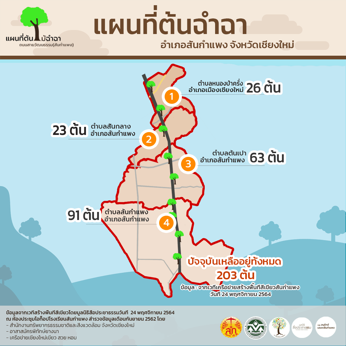 เปิดข้อมูลสำรวจเมื่อปี 2562 จากการสำรวจโดยสำนักงานทรัพยากรธรรมชาติและสิ่งแวดล้อม จังหวัดเชียงใหม่, อาสาสมัครพิทักษ์ยางนา และเครือข่ายเขียวสวยหอม พบว่าจำนวนของต้นฉำฉำหรือจามจุรีบนถนนสันกำแพง (สายเก่า) มีทั้งหมด 203 ต้น บนพื้นที่ของตำบลหนองป่าครั่ง, สันกลาง, ต้นเปาและสันกำแพง