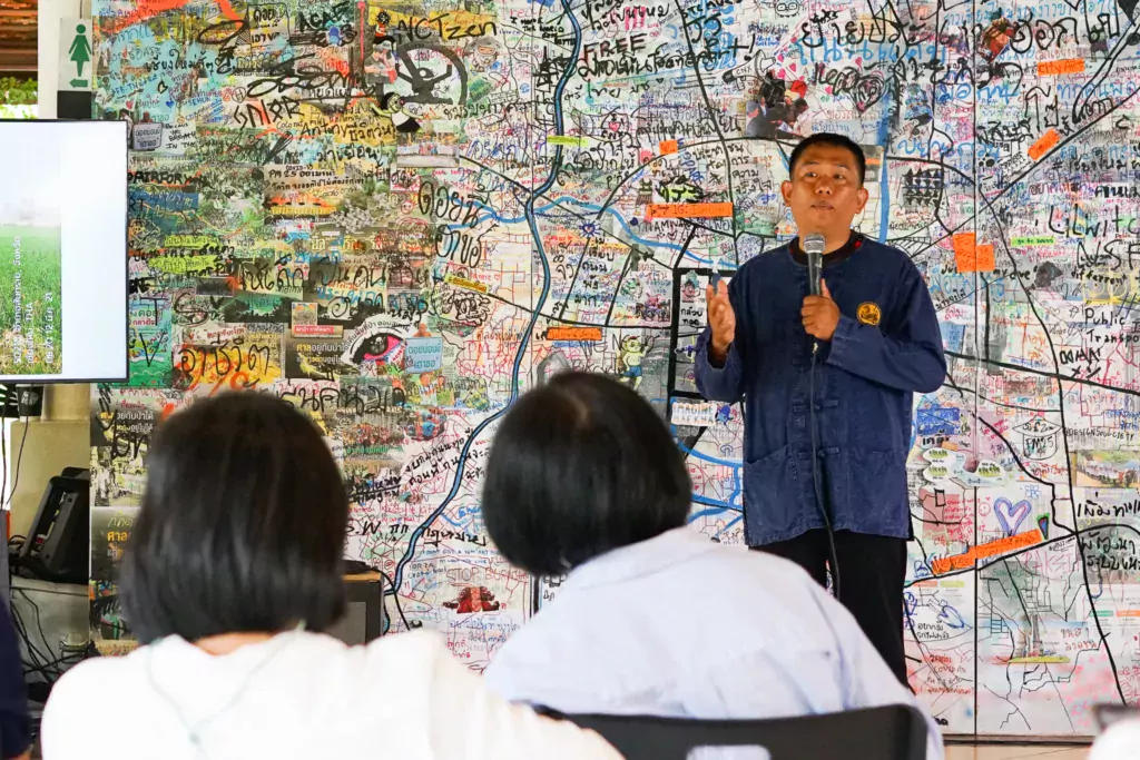 มนตรี หินมี วิสาหกิจเกษตรพัฒนาและผู้ใหญ่บ้านเกษตรพัฒนา บอกเล่าถึงปัญหาในแง่มุมการเพาะปลูก ในพื้นที่อำเภอสันทราย ที่เกิดมาจากความสุดโต่งในการใช้สารเคมีในการเกษตร ทำให้แนวคิดชุนชนกับเศรษฐกิจสีเขียวมีความสำคัญ เพื่อการประกอบอาชีพ และการพัฒนาอย่างยั่งยืนของชุมชน ควบคู่ไปกับการทำวิสาหกิจชุมชน ที่ช่วยเปิดโอกาสให้เกิดการรวมกลุ่มของคนในชุมชน และช่วยให้เล็งเห็นถึงต้นทุนทางธรรมชาติในพื้นที่ โดย มนตรี คาดหวังการต่อยอดจากคนคนรุ่นใหม่ ในการพัฒนาวิสาหกิจชุมชน