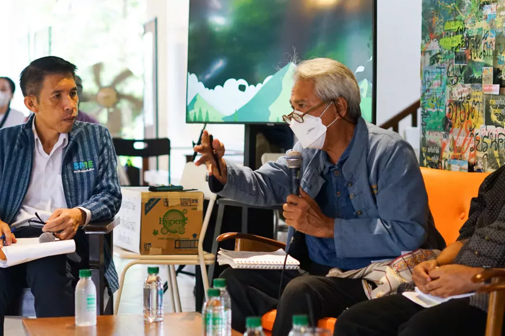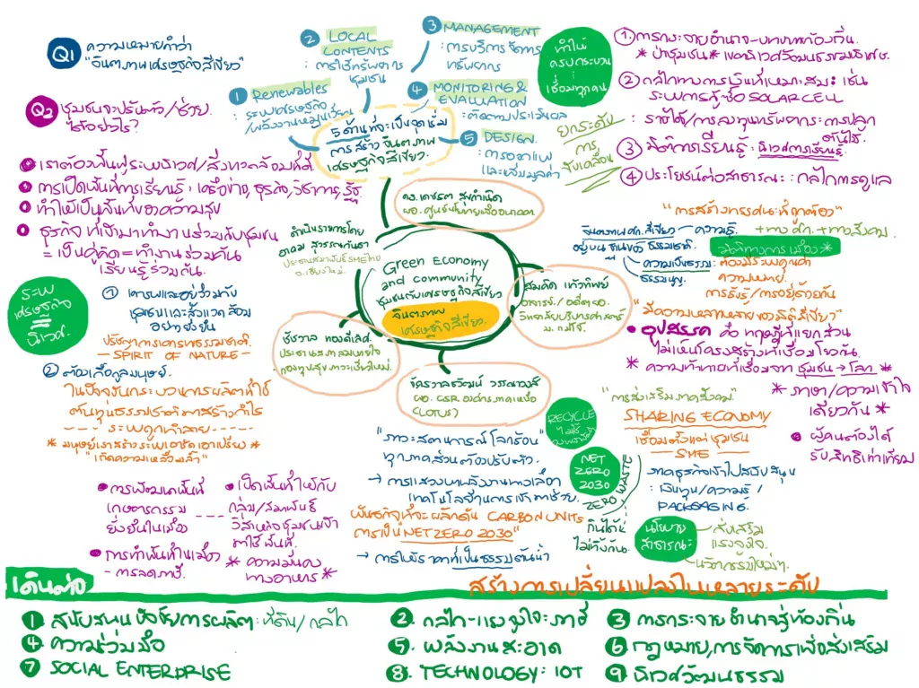 สรุปประเด็นในเวทีเสวนา “จินตภาพชุมชนกับเศรษฐกิจสีเขียว” ผู้เข้าร่วมเสวนาและแลกเปลี่ยน ได้แก่ เดชรัต สุขกำเนิด ผู้อำนวยการศูนย์นโยบายเพื่ออนาคต, สมคิด แก้วทิพย์ ผู้อำนวยการวิทยาลัยบริหารศาสตร์ มหาวิทยาลัยแม่โจ้, จักรวาลธวัฒน์ วรรณาวงศ์ ผู้จัดการแผนกความยั่งยืนองค์กร-ภาคเหนือ บริษัทเอก-ชัย ดีสทริบิวชั่น ซิสเทม จำกัด และชัชวาลย์ ทองดีเลิศ ประธานสภาลมหายใจ ดำเนินรายการโดย อาคม สุวรรณกันธา ประธานสมาพันธ์ SME ไทย จังหวัดเชียงใหม่