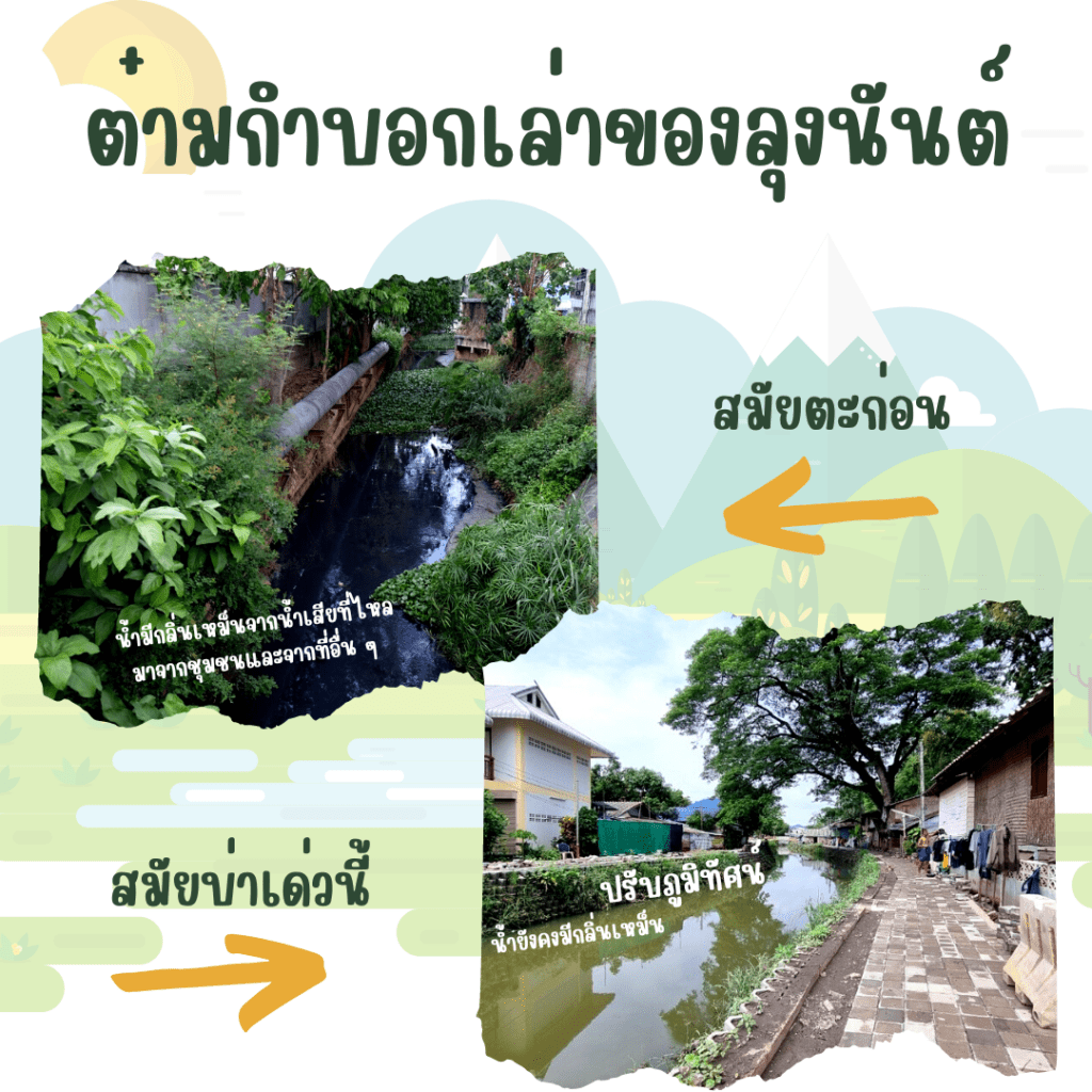 น้ำต้อน้ำพาเดินชุมชนคลองแม่ข่ากับลุงอนันต์ ชัยคำปอง ประธานชุมชนกำแพงงามที่อยู่ริมคลองแม่ข่า โดยจะเล่าถึงคลองแม่ข่าที่เปรียบเสมือนหน้าบ้านของคนในชุมชน แต่การจัดการน้ำเสียยังคงเป็นปัญหามาอย่างช้านาน แม้จะมีภาครัฐ ภาคประชาสังคมเข้ามาช่วยเหลือจัดการหลายครั้งก็ตาม