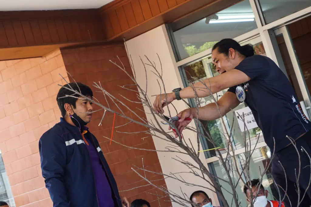 เข้าสู่ช่วงบ่าย หมอต้นไม้ Happy Tree ครบทีม ขนอุปกรณ์ปีนป่ายและทุ่นแรง พาผู้เข้าร่วมทดลองตัดตกแต่งกิ่งอย่างถูกต้องตามฉบับรุกขกร เช่น การตัดทอนกิ่งให้น้ำหนักเบาลง การตัดแบบเว้นระยะห่างจาำคอกิ่งเพื่อหลีกเลี่ยงแผล การฉีกขาด พื้นที่ให้ทุกคนเรียนจริง ใช้จริง