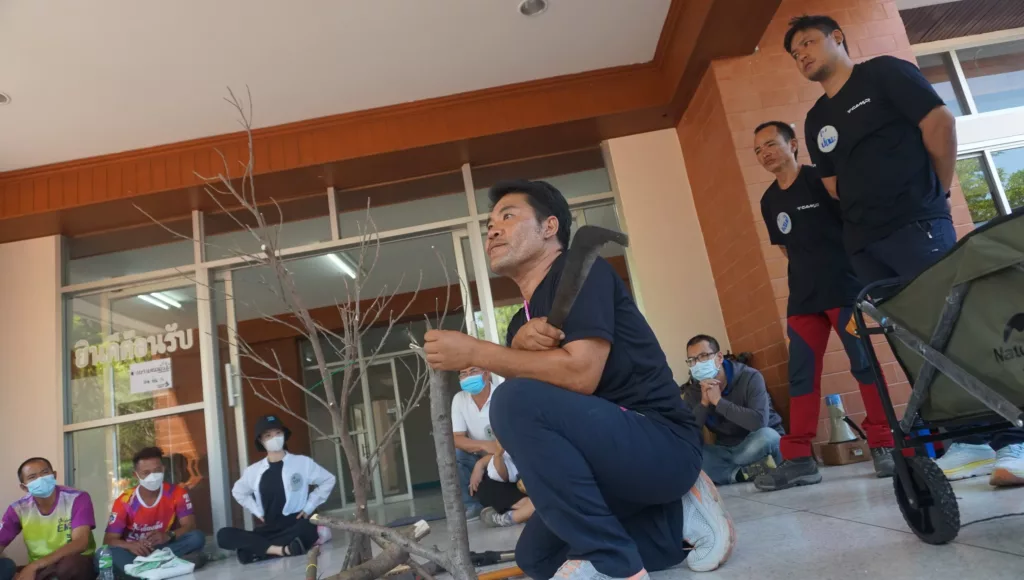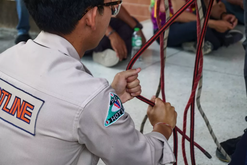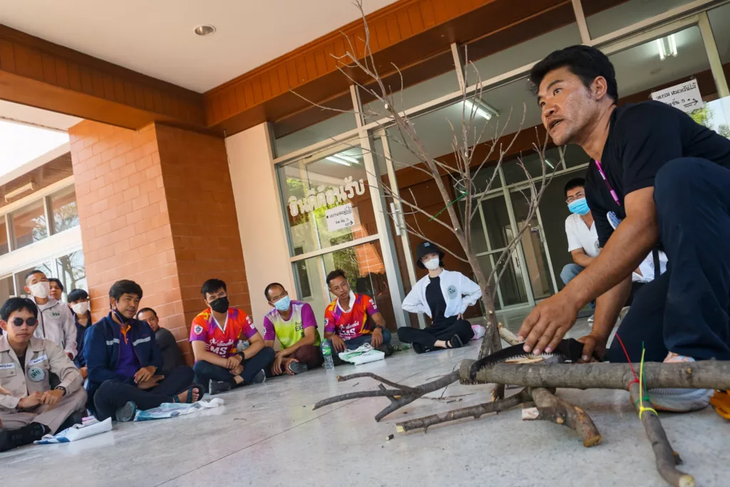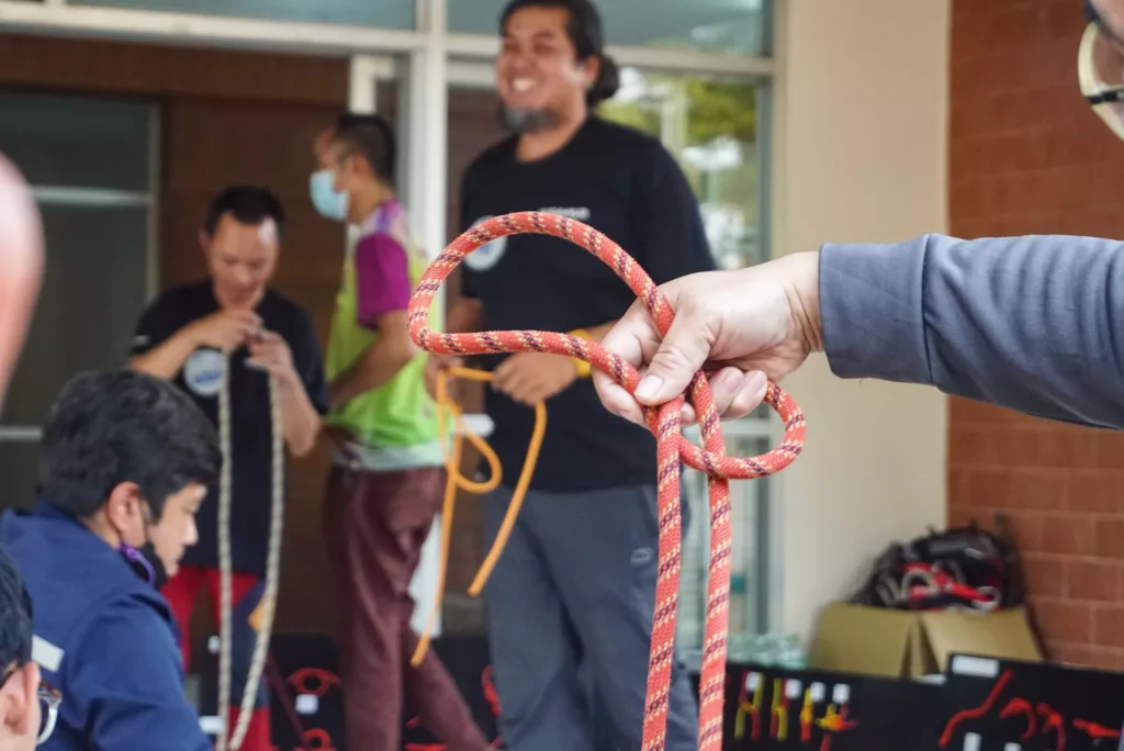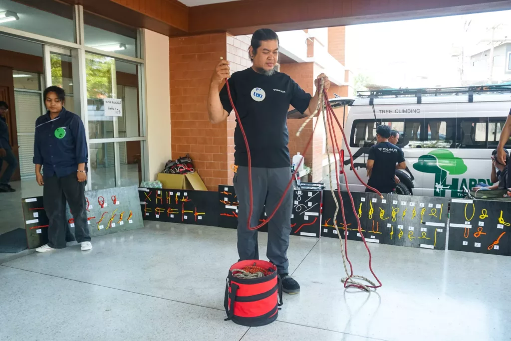ผู้เข้าร่วมตั้งใจเรียนรู้การผูกเงื่อนที่จำเป็นต่องานที่สูง ผลัดกันทดลองหยิบจับ ผูกปม ร้อยเรียงเชือกที่สำคัญต่องานรุกขกรรม อย่างเงื่อนตะกรุดเบ็ด เงื่อนพิรอด หรือ เงื่อนบ่วงสายธนู 2 ชั้น