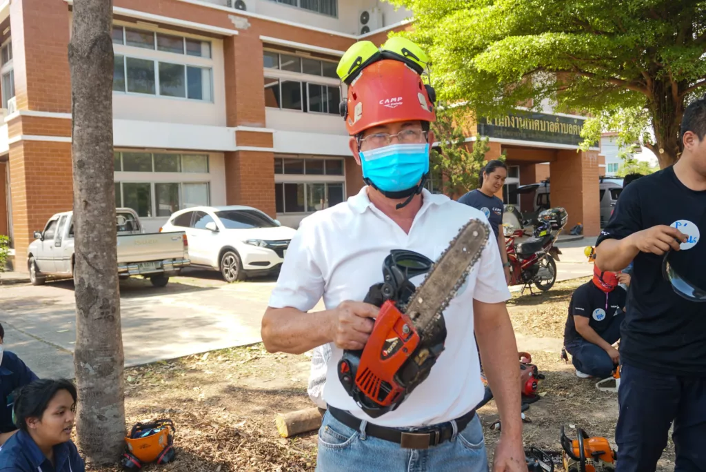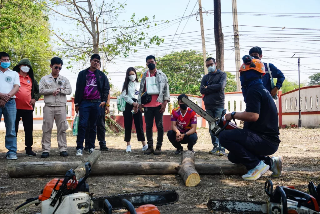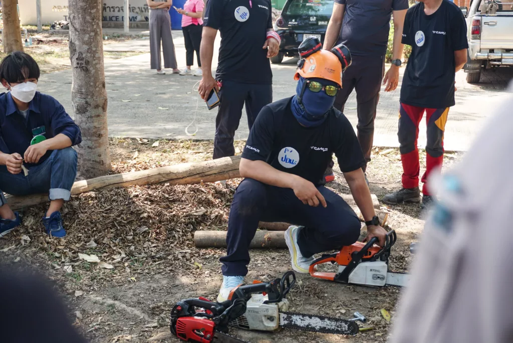 หลังจากเรียนรู้การตัดกิ่งด้วยกรรไกรตัดกิ่ง เลื่อยแล้ว มาสู่งานหินที่สำคัญมากหากจะต้องตัดไม้ใหญ่ นั้นคือ เลื่อยยนต์ไฟฟ้า ผู้เข้าร่วมต่างใจจดใจจ่อกับวิธีการสาธิตประกอบเลื่อยยนต์อย่างไรให้ถูกวิธี พร้อมเทคนิควิธีการใช้ ผลัดกันไปลองหยิบจับเลื่อยท่อนไม้ตัวอย่างกันอย่างสนุกสนาน บ้างอาจไม่คุ้นมือ บ้างอาจเคยลองมาแล้ว แต่ทุกคนอุ่นใจเพราะมี หมอต้นไม้ Happy Tree ประกบข้างอยู่เสมอ