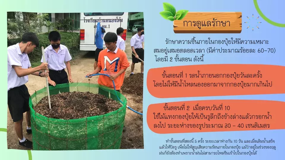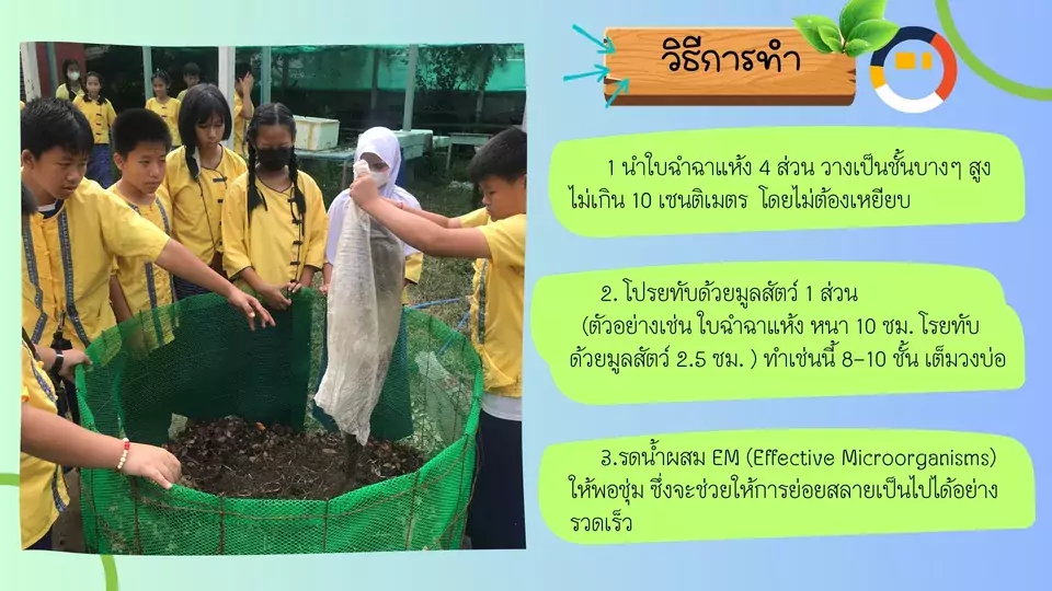 ต่อมา อธิพันธ์ กันทอน ครูโรงเรียนบ้านหนองโค้ง กล่าวถึงความสำคัญของการทำปุ๋ยหมักฉำฉาในครั้งนี้ว่าเพื่อให้กับคนในชุมชนได้รับรู้ว่าเป็นสิ่งที่มีประโยชน์ ต่อยอด สร้างรายได้ สร้างอาชีพจากสิ่งนี้ และอธิบายถึงขั้นตอนในการทำปุ๋ยหมัก