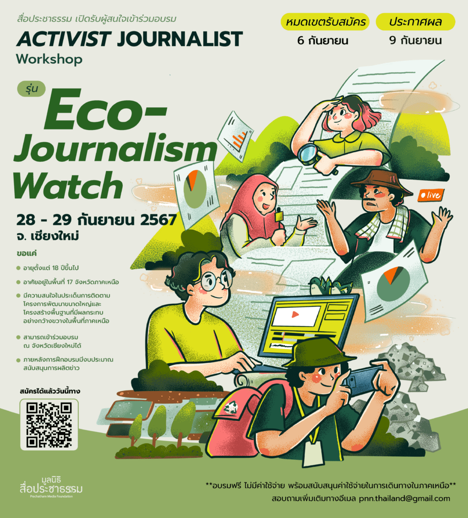สื่อประชาธรรม เปิดรับสมัครผูัเข้าร่วมในโครงการอบรม Activist Journalist รุ่น Eco-Journalism Watch ที่มุ่งเน้นการเสริมศักยภาพนักข่าวพลเมืองรุ่นใหม่ด้านสิ่งแวดล้อม ชุมชนท้องถิ่น และภาคประชาสังคมในพื้นที่ที่จะมีการดำเนินโครงการขนาดใหญ่ในพื้นที่ภาคเหนือของประเทศไทย เพื่อให้มีความเข้มแข็งในการรายงานข่าวประเด็นผลกระทบทั้งที่ยังไม่เกิดขึ้น และเกิดขึ้นไปแล้วของโครงการพัฒนาขนาดใหญ่