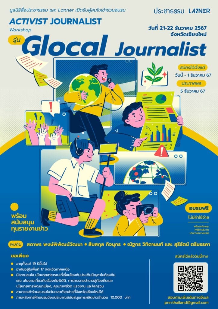 สื่อประชาธรรม และ Lanner เปิดรับสมัครผูัเข้าร่วมในโครงการอบรม Activist Journalist รุ่น Glocal Journalist ชวนนักข่าวพลเมืองและคนรุ่นใหม่ร่วมกันค้นหามุมมอง และประเด็นการทำข่าวจากนักข่าวที่มีประสบการณ์ในการทำข่าว รวมถึงผู้มีความรู้ความเชี่ยวชาญในแต่ละเรื่องที่เกี่ยวข้องกับนโยบายสาธารณะ เช่น เรื่องภัยพิบัติและโลกรวน การกระจายอำนาจสู่ท้องถิ่น โครงการพัฒนาเมือง โครงการพัฒนาคุณภาพชีวิต เป็นต้น